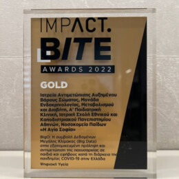 Στα Impact BITE Awards 2022 (www.businessitawards.gr), το βραβείο GOLD στον Πυλώνα Ψηφιακή Αριστεία για τον COVID-19, στην κατηγορία Ψηφιακή Υγεία απονεμήθηκε για το έργο “BigO: Η συμβολή Δεδομένων Μεγάλης Κλίμακας (Big Data) στην εξατομικευμένη πρόληψη και αντιμετώπιση της παχυσαρκίας σε παιδιά και εφήβους κατά τη διάρκεια της πανδημίας COVID-19 στην Ελλάδα”.