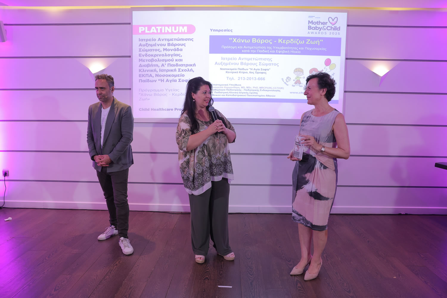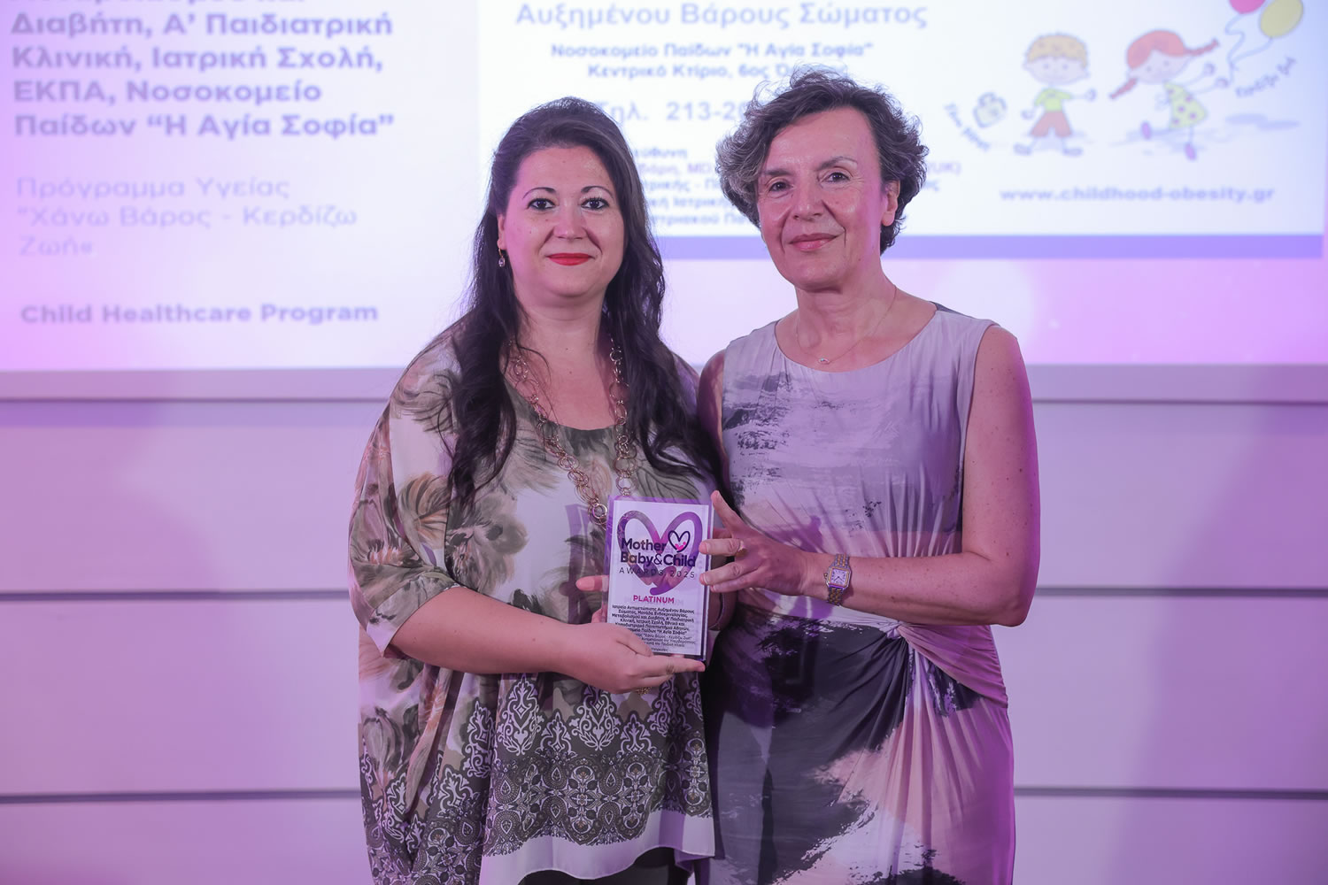 Τα βραβεία PLATINUM και GOLD στην κατηγορία Υπηρεσίες – Child Healthcare Program απονεμήθηκαν στο Ιατρείο Πρόληψης και Αντιμετώπισης Αυξημένου Βάρους Σώματος, Μονάδα Ενδοκρινολογίας, Μεταβολισμού και Διαβήτη, Α΄ Παιδιατρική Κλινική, Ιατρική Σχολή Εθνικού και Καποδιστριακού Πανεπιστημίου Αθηνών, Νοσοκομείο Παίδων ‘Η Αγία Σοφία’.